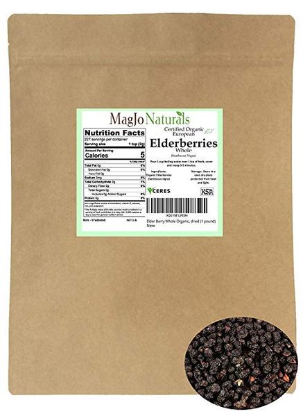 - 100% dried organic elderberry from Europe. Certified organic by German organic certification Ceres. Organic Whole Elderberries are dried berries with a fruit aroma and sweet-tart, fruity flavor. They make tasty, warming tea. The berries are dark purple and have a wrinkled appearance. Kosher certified and non-irradiated.